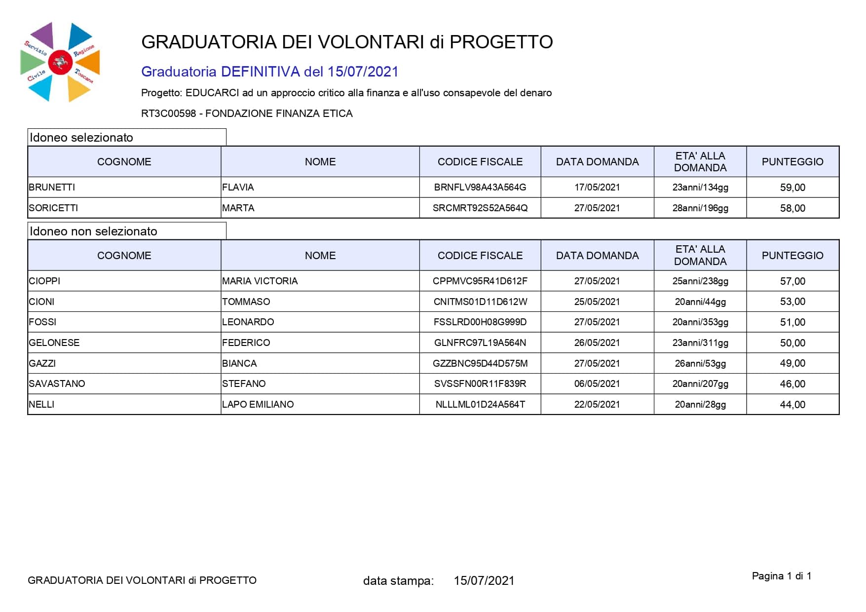 In base alla valutazione dell’idoneità dei candidati allo svolgimento dello specifico progetto di servizio civile, sulla base del cv e di un colloquio, l’ente ha stilato la graduatoria dei candidati qui di seguito riportata.